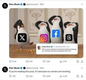 میٹا کی سروسز کے اچانک بند ہونے کے بعد سماجی رابطوں کی ویب سائٹ ایکس (سابقہ ٹویٹر) کے مالک ایلون مسک نے اسے ٹرول کردیا۔ایکس پر اپنے پیغام میں انہوں نے لکھا کہ اگر آپ یہ پیغام پڑھ رہے ہیں تو اس کا مطلب ہے ہمارے سرورز کام کر رہے ہیں۔ساتھ میں ایلون مسک نے ایک میم بھی شیئر کی جس میں میٹا سروسز ایکس کو سلیوٹ کر رہی ہیں۔